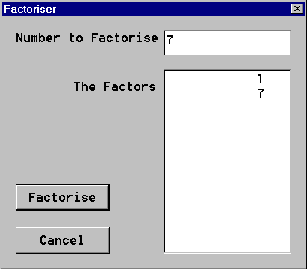 |  | Enter any whole number up to 13 digits long (one less than 10 million million or 10 trillion in USA and 10 billion in Britain, France and German), press the factorise button and all the factors are listed in the list box bellow the number entered.